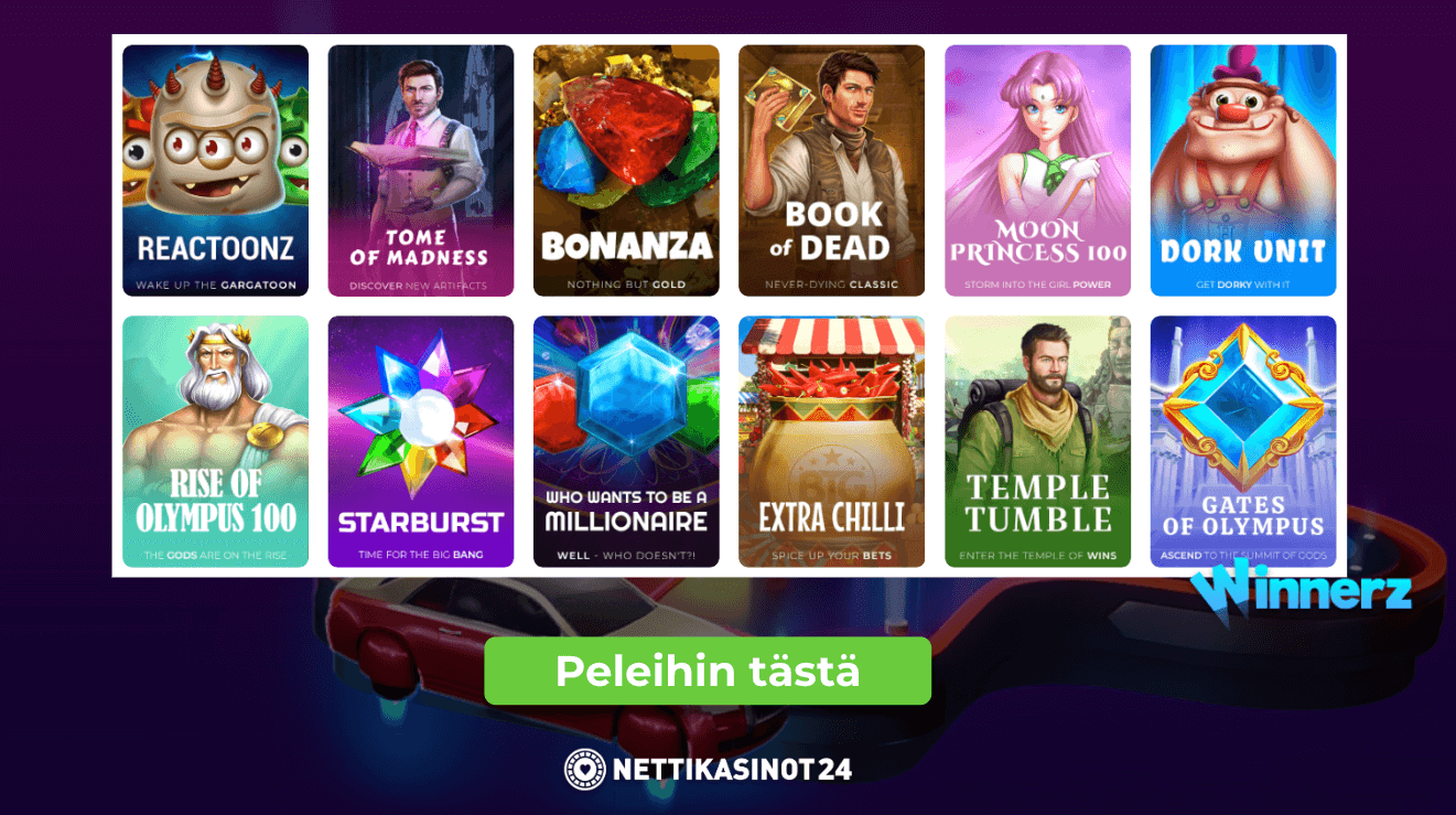 Kolikkopeleistä löydät alan suosituimmat ja uusimmat slotit ja videoautomaatit. Tarjolla on kattava valikoima erilaisia teemoja, ominaisuuksia ja tehosteita. Winnerzillä voit pelata muun muassa Netentin klassikkoslotteja kuten Gonzo’s Questia tai Starburstia, tai kokeilla Play’n Go:n rakastettuja Reactooz ja Moon Princess -kolikkopelejä. Winnerzin pelivalikoima on luotu juuri kotimaiseen makuun, ja pelien turvallisuudesta huolehtivat satunnaislukugeneraattorit ja laadukkaat pelintarjoajat.